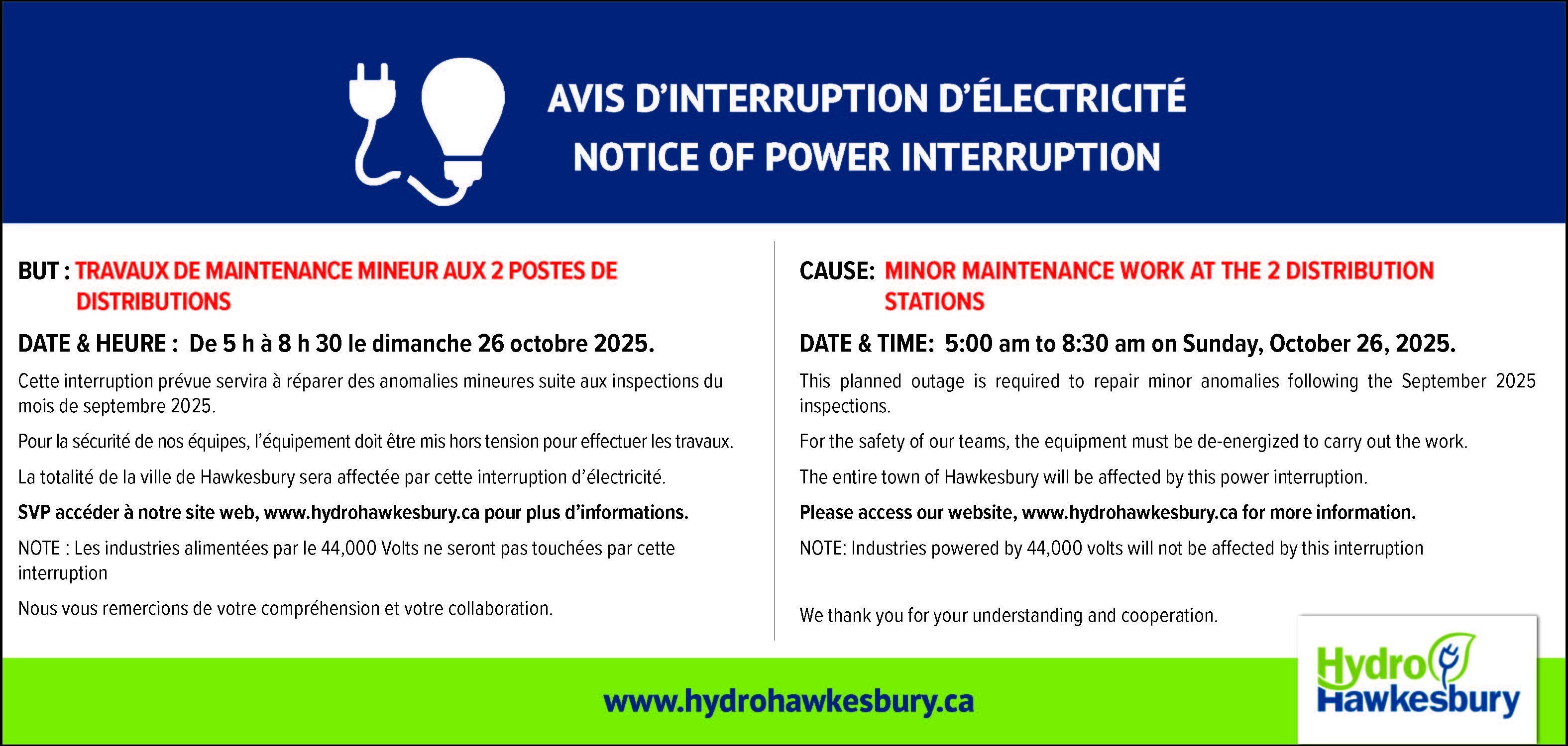A scheduled power outage will take place to correct minor issues. To ensure the safety of our crews, equipment must be powered down during the work. This outage will affect the entire town of Hawkesbury.